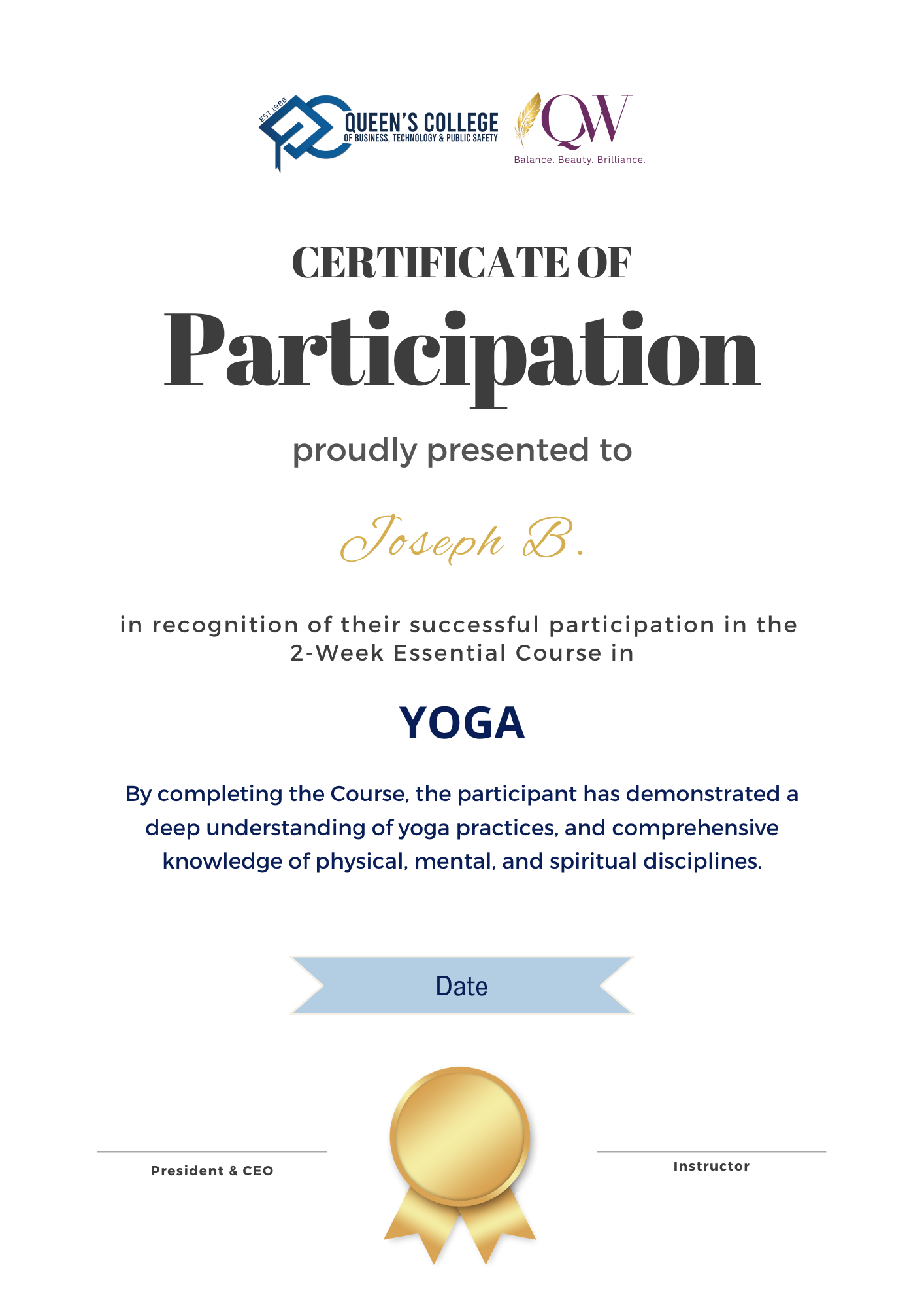 Contact us for more details! Email: wellness@queenscollege.ca Phone: (905)-890-7833 2-Week Essential Yoga Course (6 Hours) Hassel Free Beginner Friendly Dive into our 2-Week Essential Yoga Course, perfect for beginners or busy professionals looking for a quick mental and physical refresher. Enrol Here Course overview Methods Online/On-Campus Duration 2 Weeks Difficulty Easy Certificate Granted Curriculum Intro to Yoga & Body AwarenessFoundations of yoga and mindful movementSimple standing and seated asanas (poses)Enhancing body awareness through conscious breathingFlexibility, Flow & Alignment Dynamic stretching and mindful movementEnergizing sun salutations and gentle flow sequencesImproving posture alignment and supporting spinal health Relaxation & Daily Wellness Tools Yoga practices to enhance sleep quality and reduce stress Guided meditations and breathwork for inner balance Lifestyle tips for integrating yoga into daily life Course Details Duration & Format Fees Duration & Format Start Date: December 2nd, 2025 Total Duration: 2 Weeks (6 hours/6 sessions) Schedule: Tuesday, Thursday & Saturday OR Wednesday, Friday & Sunday Time: 5:30 PM – 6:30 PM Delivery Method: Online & On-Campus Fees On-Campus at the Mississauga studio Cost: $150 CAD Online Cost: $120 CAD Course Certification Upon successful completion of the course, you will receive a Certificate of Participation.